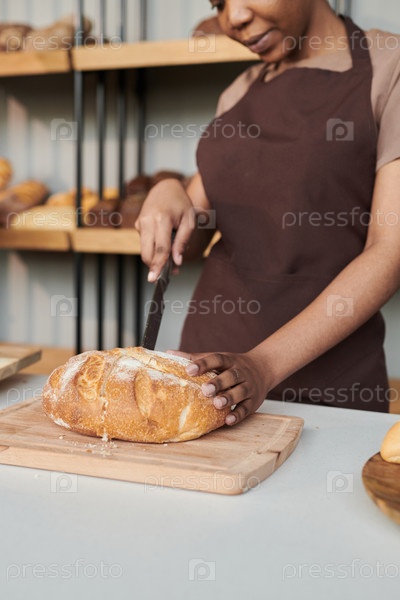 Молодая женщина режет свежий хлеб