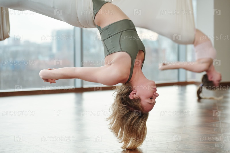 Две молодые женщины, выполняющие антигравитационную поза сгибания назад в то время как висят над полом тренажерного зала