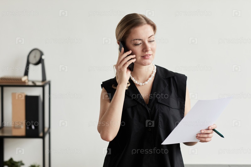 Успешная бизнесвумен разговаривает по телефону минимально