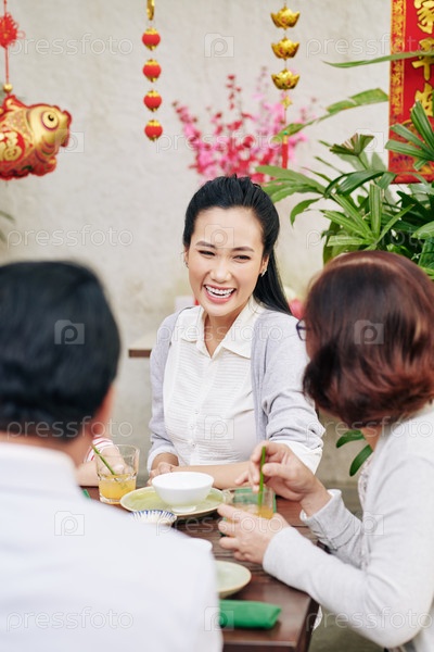 Женщина празднует китайский Новый год с семьей
