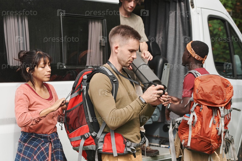 Серьезный молодой человек просматривает фотографии на дисплее камеры, в то время как его друзья разгружают туристические вещи из фургона