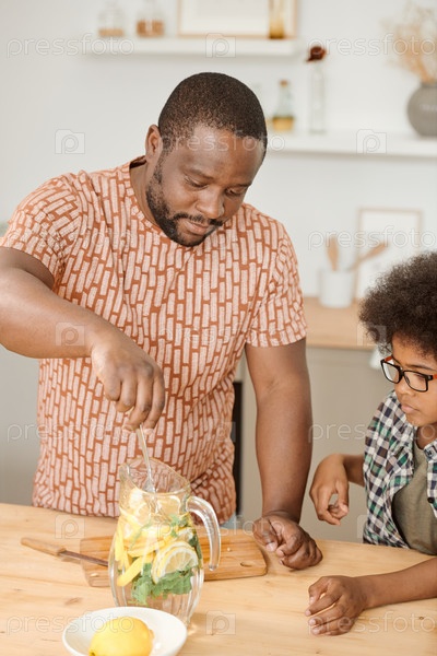 Молодой отец смешивает нарезанный лимон и срезанные мятовые листья в кружке