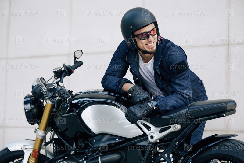 Улыбающийся мужчина в шлеме, опираясь на мотоцикл