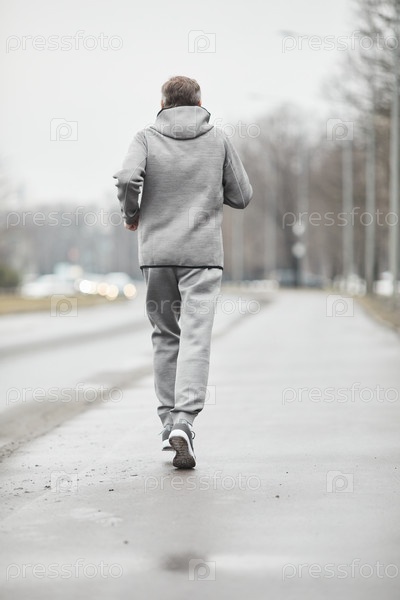 Спина человека, бегущего вдоль дороги