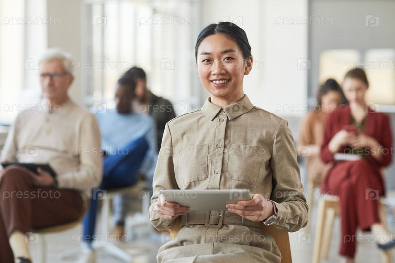 Улыбающаяся азиатская бизнесвумен на семинаре