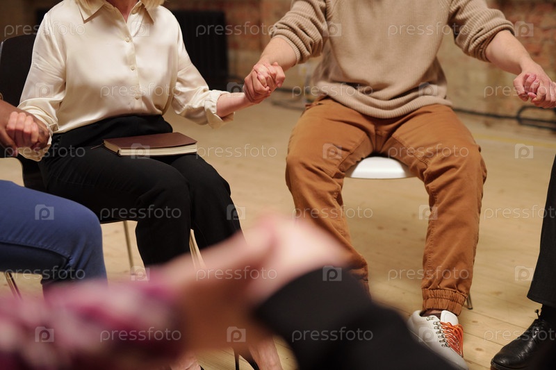 Несколько межкультурных пациентов психологической группы, держащихся за руки во время сеанса