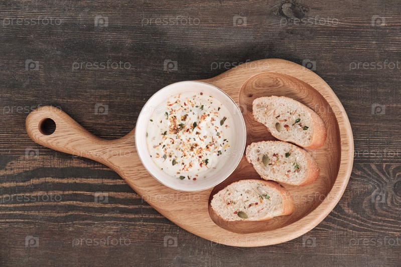 Белый соус и ломтики багет