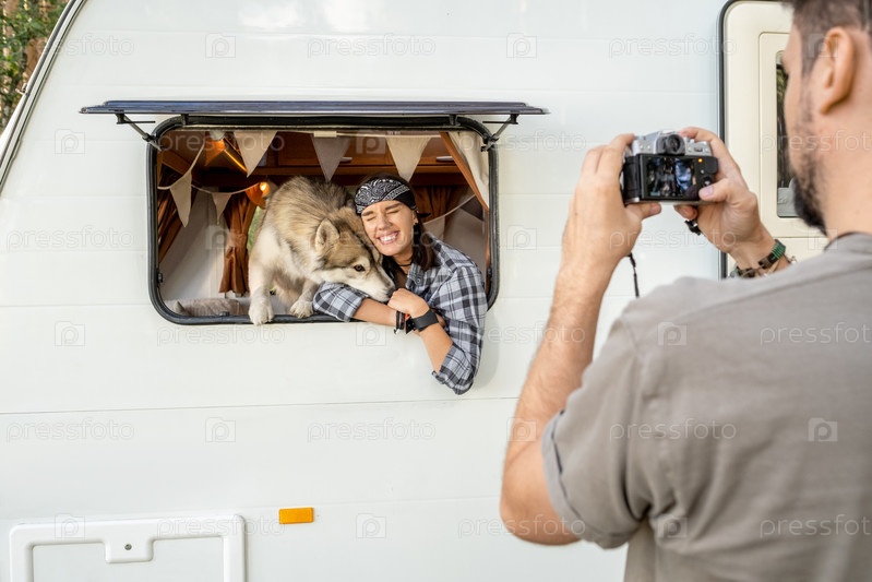 Милая самка и любящая собака хаски в окне туристического дома