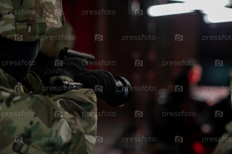 Мужчина в военном костюме, держащий фонарь и пистолет