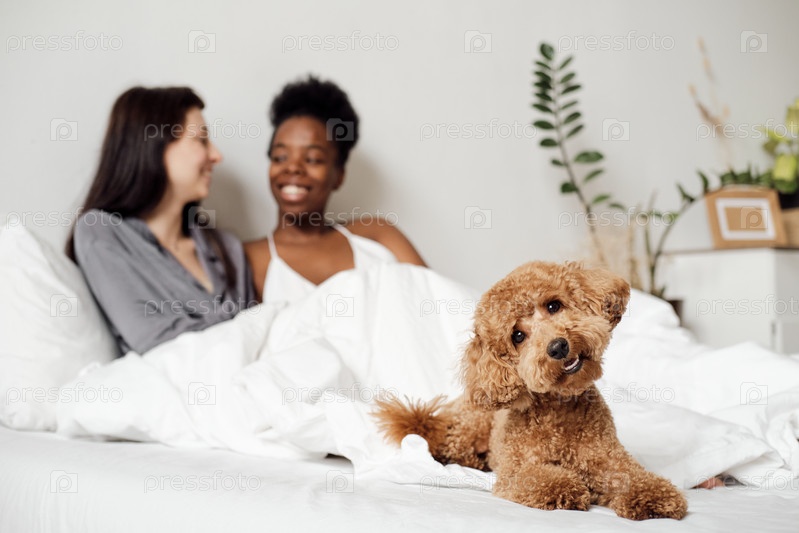 Пушистый питомец смотрит на тебя против лесбийской пары