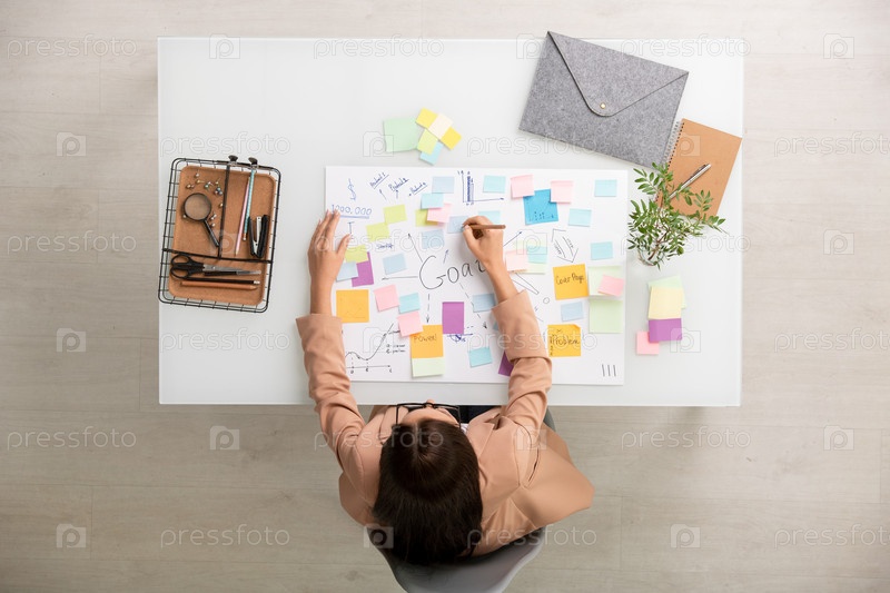 Обзор молодой элегантной деловой женщины, делающей рабочие заметки на документе