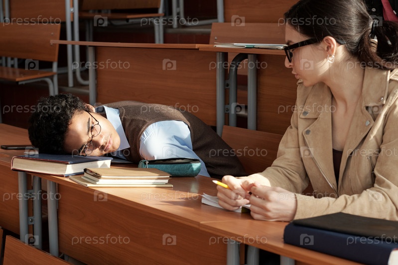 Усталый студент, держащий голову на книге, сидя рядом со своим одноклассником