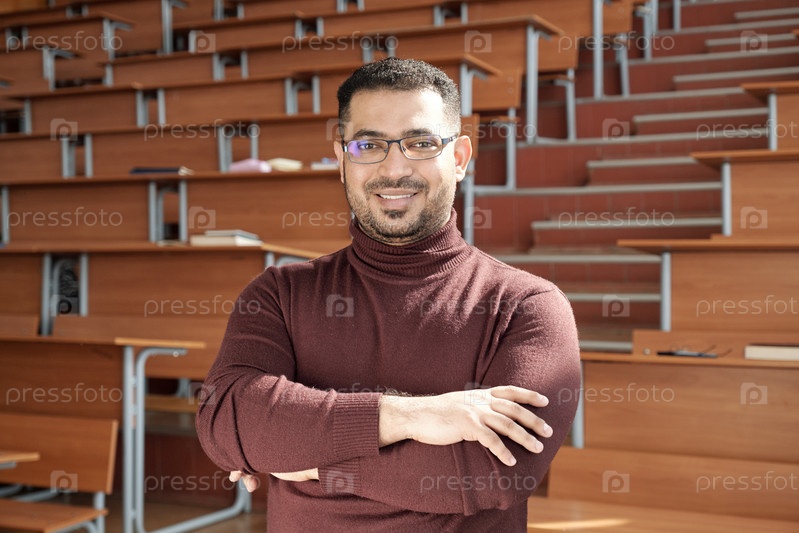 Молодой успешный преподаватель университета скрещивает руки за грудь, стоя в аудитории