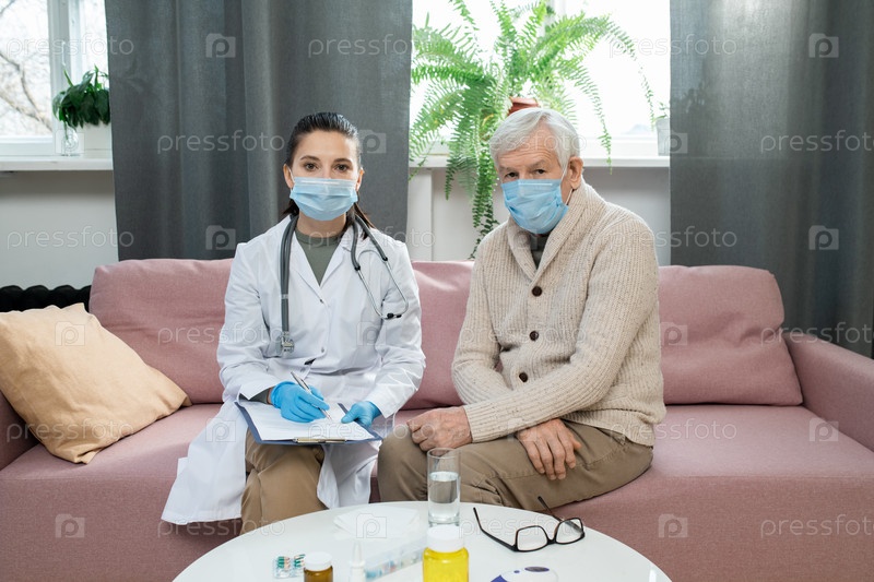 Больной пожилой пациент и молодой врач общей практики в масках сидят на диване