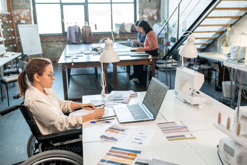 Молодой серьезный дизайнер на инвалидной коляске рисует эскизы для новой сезонной коллекции в мастерской