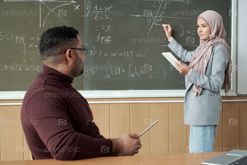 Уверенный в себе профессор и студентка в хиджабе смотрят друг на друга, пока девушка решает уравнение