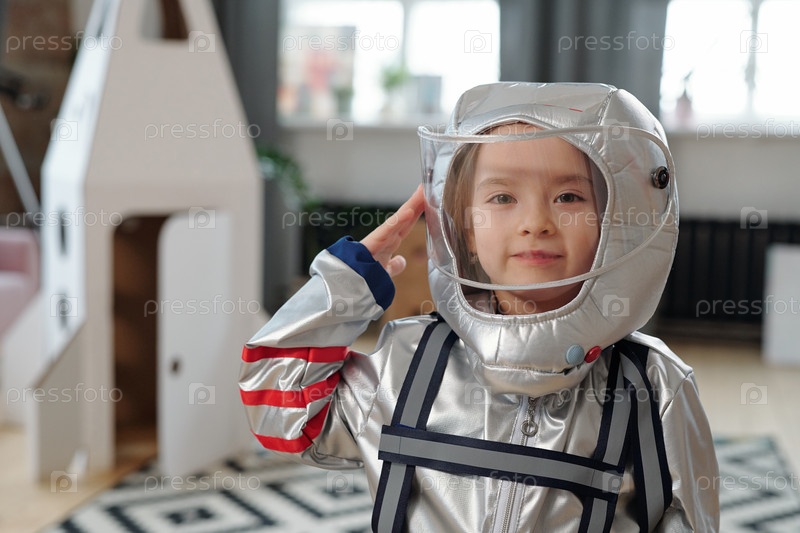 Милая девочка в космическом костюме стоит в гостиной