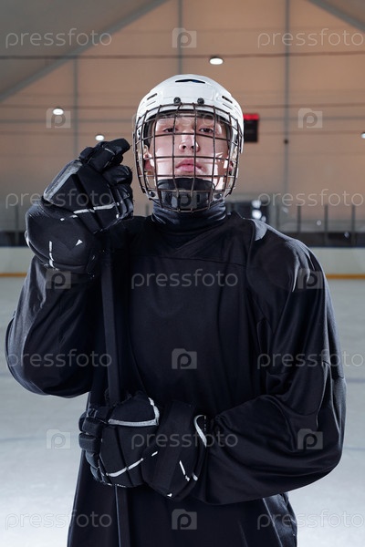 Профессиональный хоккеист в черной спортивной форме стоит на катке после игры