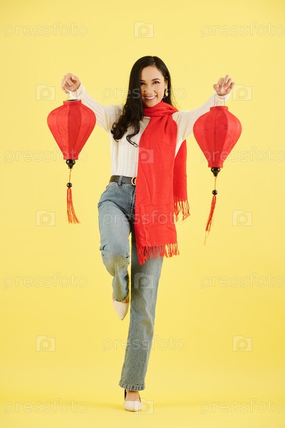 Веселая женщина с бумажными фонарями
