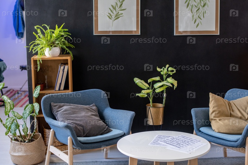 Два кресла с подушками и столом в комнате или студии