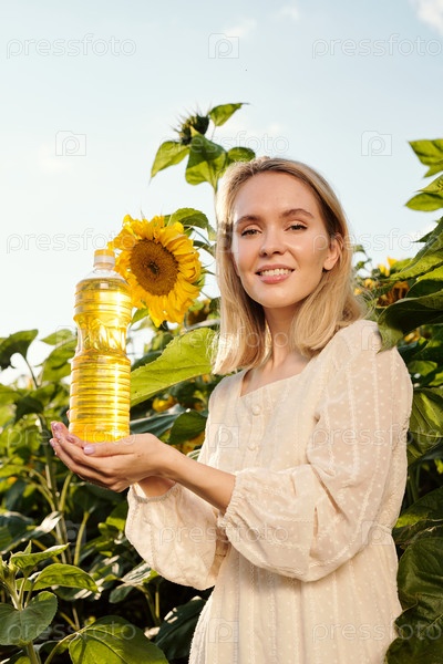 Красивая блондинка, молодая женщина держит бутылку подсолнечного масла в поле