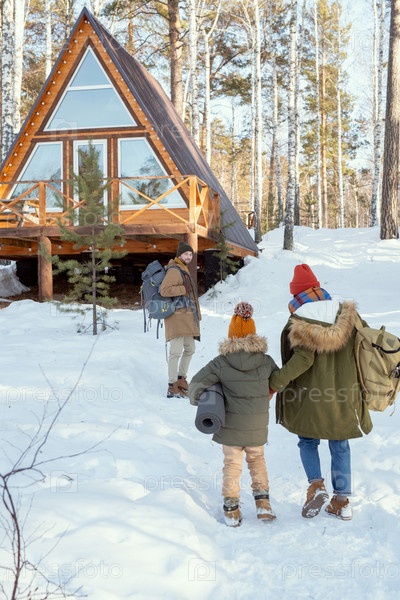 Мужчина с рюкзаком стоит у загородного дома и смотрит на свою жену и дочь