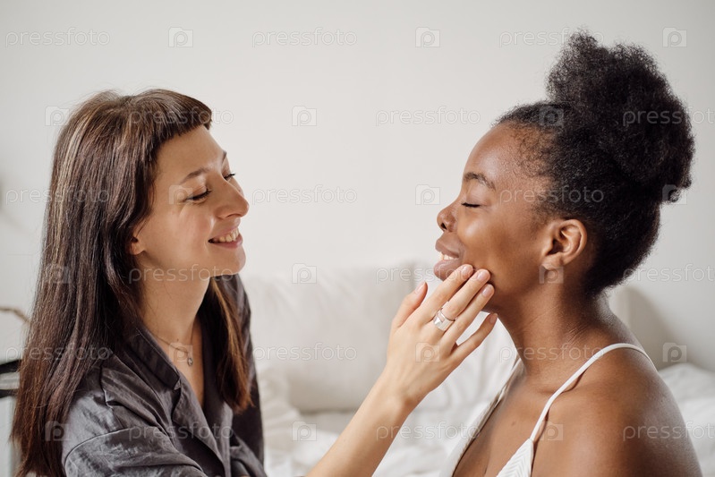Счастливая женщина наносит крем на лицо своей африканской девушки