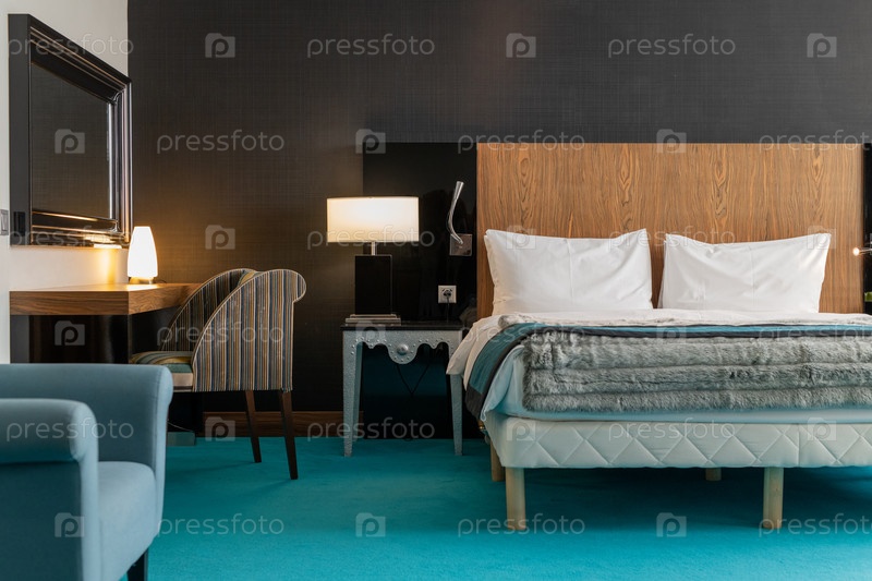 Интерьер большого роскошного гостиничного номера с двуспальной кроватью, двумя креслами, лампами, столом и зеркалом