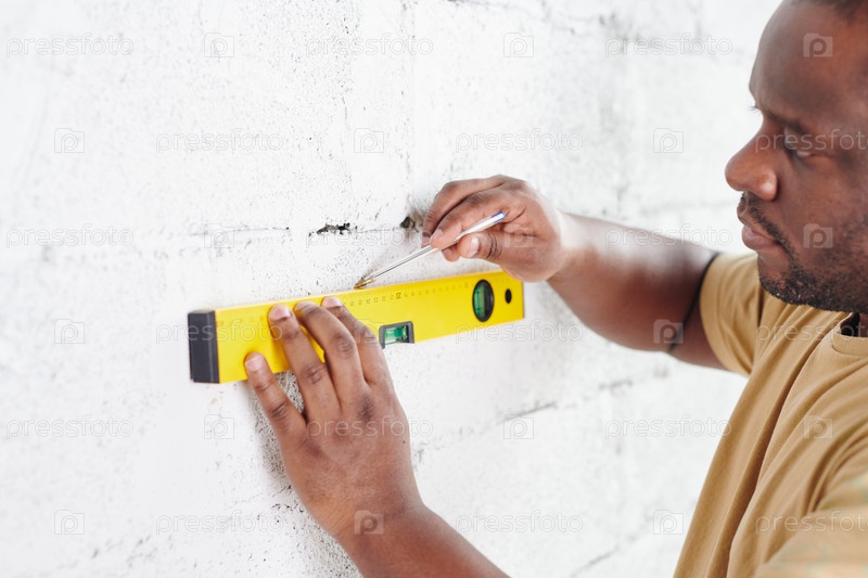 Африканский мужчина с чертежной линией карандашом на белокрашенной кирпичной стене, используя рукоятку для измерения уровня