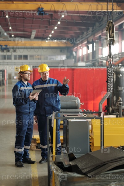 Два инженера стоят в большой мастерской или заводе и обсуждают новое промышленное оборудование или машину