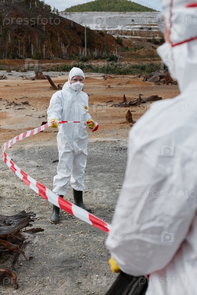 Экологические специалисты в защитных костюмах отмечают загрязненные районы предупреждающей лентой на заброшенной территории