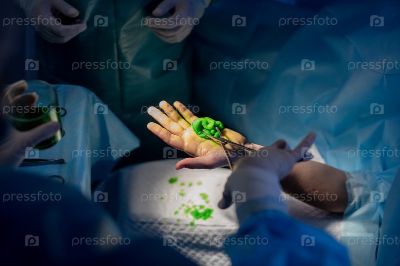 Профессиональные хирурги протирают руку пациента зеленым куском повязки