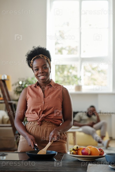 Молодая улыбающаяся женщина африканской этнической принадлежности смотрит на тебя, стоя у электрической плиты