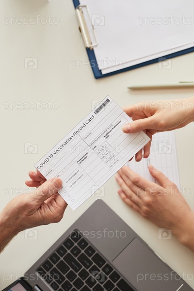 Врач вручает карту вакцинации пациенту Top View