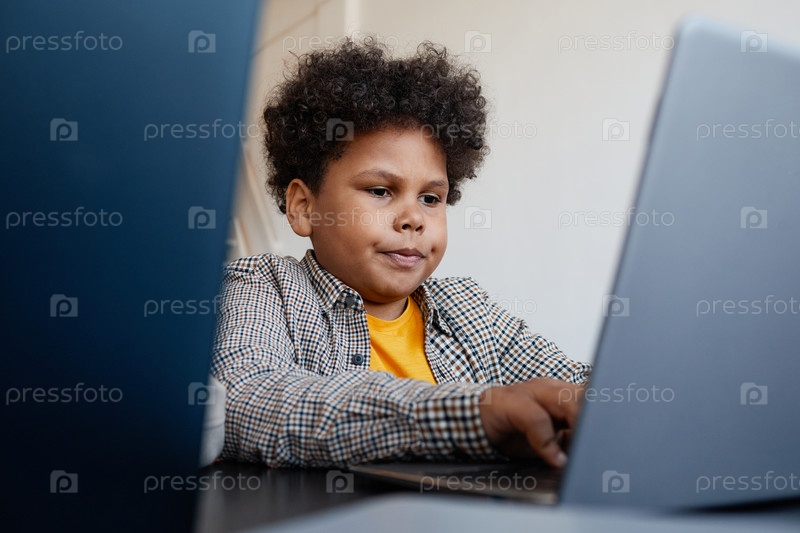 Афроамериканский мальчик, использующий компьютер в школе