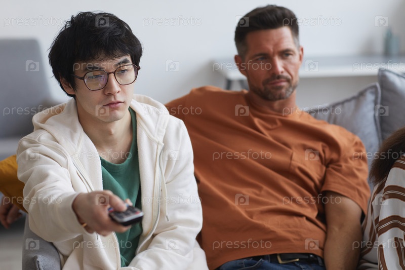 Молодой человек держит пульт дистанционного управления телевизором