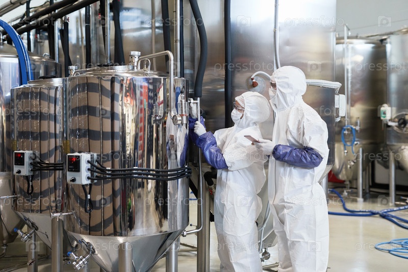 Два работника, одетых в опасные костюмы на химической фабрике