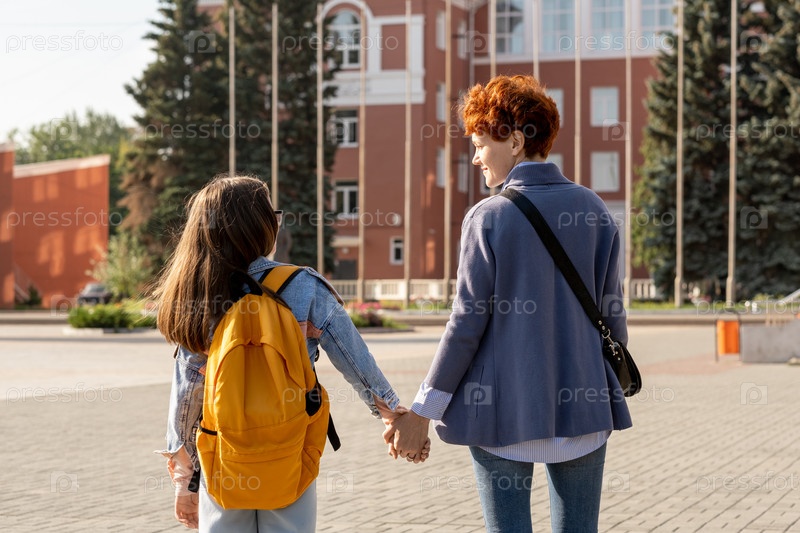 Задний вид матери, проводящей дочь в путь, пока они оба держатся за руки