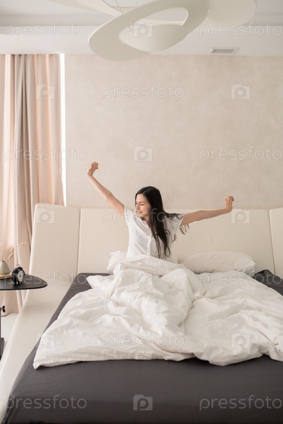 Счастливая молодая женщина, протягивающая руки в постели