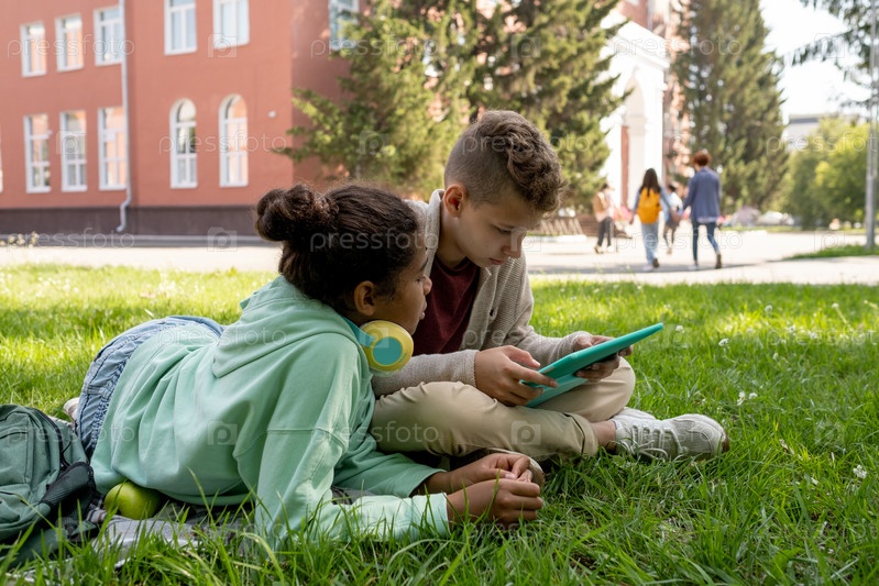 Два школьника в повседневной одежде смотрят любопытное видео в сети