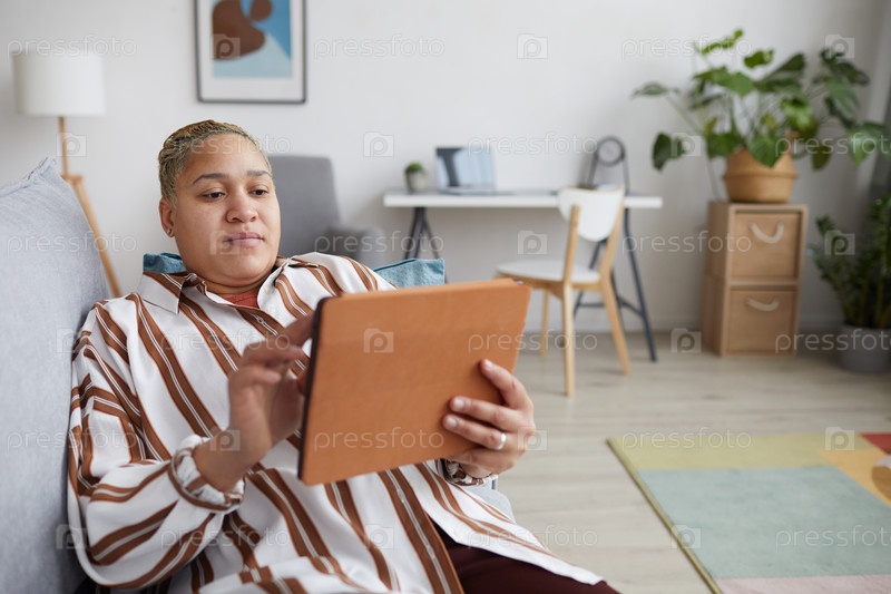 Женщина смешанной расы, использующая цифровой планшет на диване