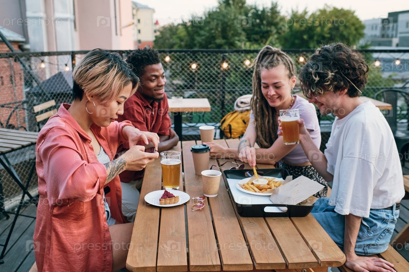 Счастливые межкультурные друзья, получающие фаст-фуд и напитки в открытом кафе