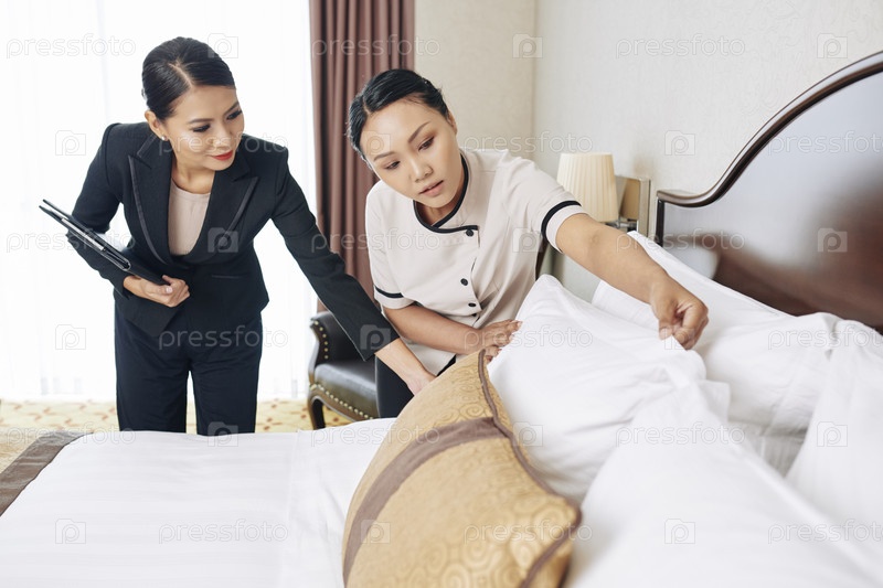 Менеджер отеля обучает новую горничную