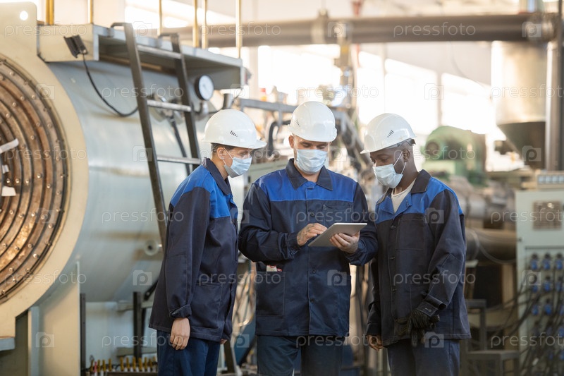 Группа молодых современных рабочих промышленного завода, смотрящих в Интернете на эскизы деталей