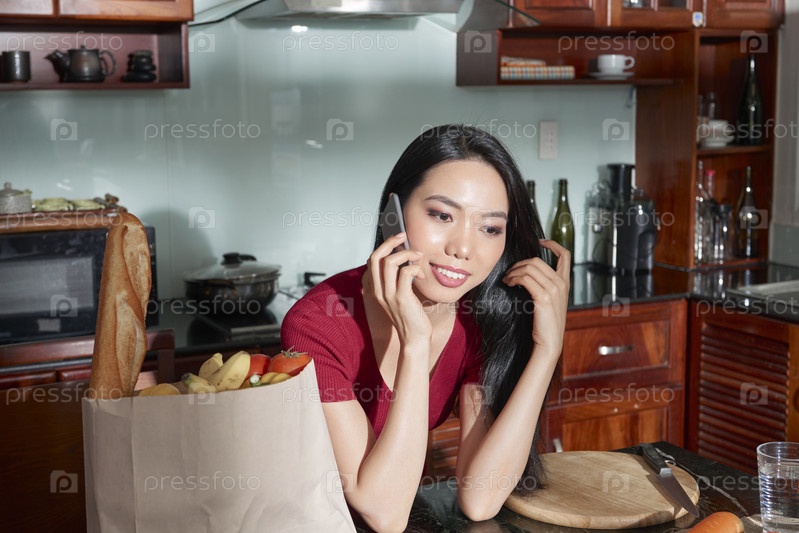 Привлекательная женщина разговаривает по телефону на кухне