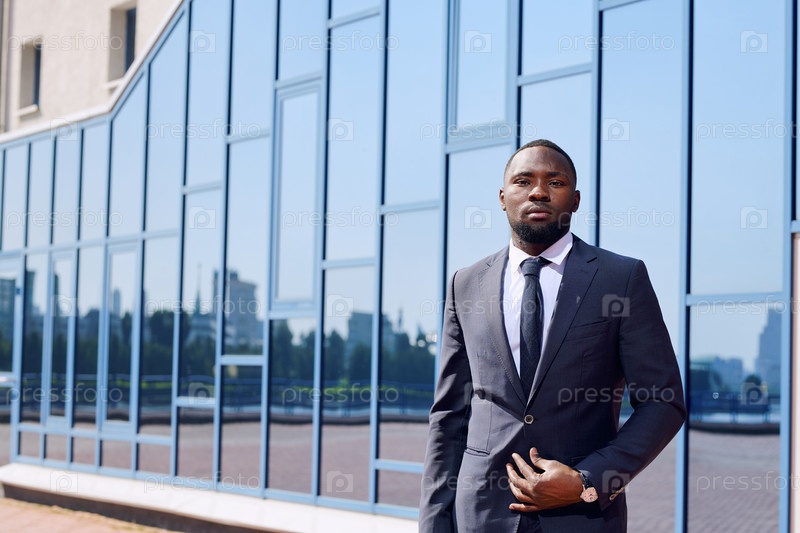 Молодой африканский бизнес-профессионал в элегантном костюме стоит перед камерой напротив здания