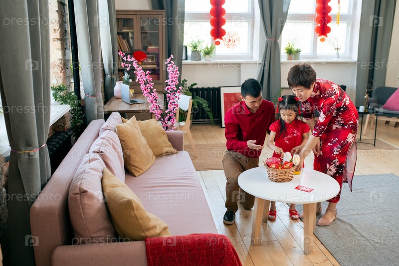 Китайская семья готовит новогодний подарок для своих друзей или родственников