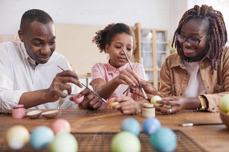 Современная афроамериканская семья рисует пасхальные яйца вместе дома