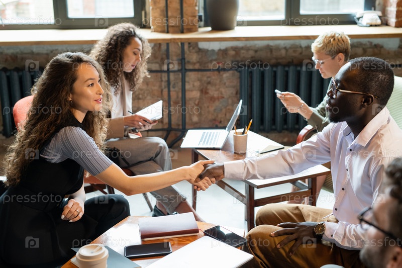 Два молодых коллеги, рукопожатые после заключения соглашения