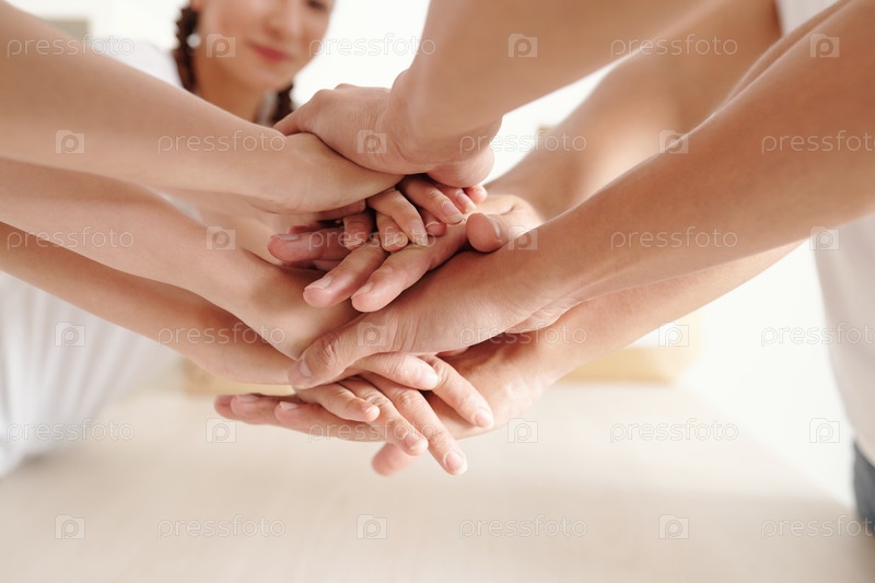 Мужчины и женщины, складывающие руки мужчины